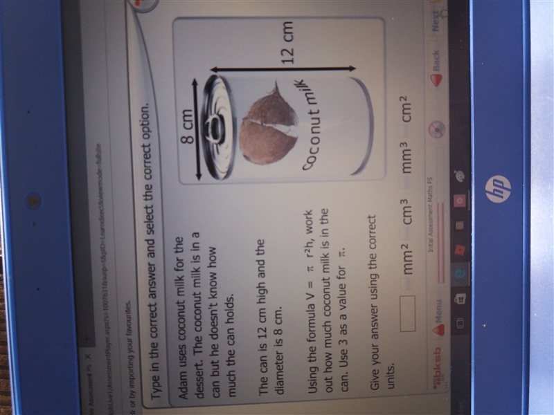 The Vilume formula is r²hπ = 4²*12*π = 16*12*π = 192π cm³