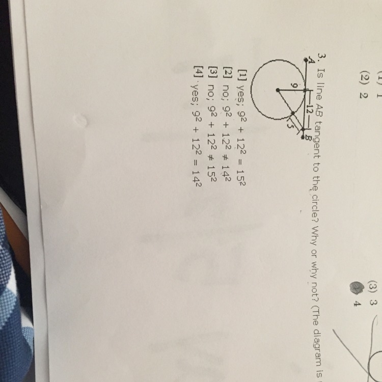 The length from b to the centre is 14 as the radius is 9 and the outer length is 5. Therefore if ab is a tangent, pythagoras theorem would apply in that 9^2 + 12^2 should equal the hypotenuse squared. However 14^2 does not equal 9^2 + 12^2 so the answer is option 2.