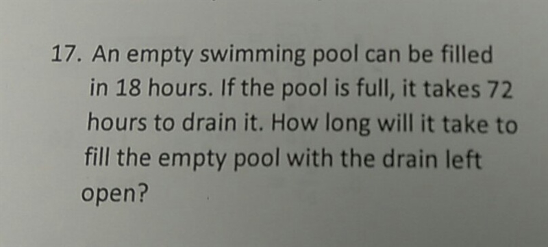 17. An empty swimming pool can be filled in 18 hours. If the pool is full, it takes 72 hours to drain it. How long will it take to fill the empty pool with the drain left open?<…