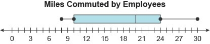 The box plot represents the number of miles employees at a bank commute to work in a week.