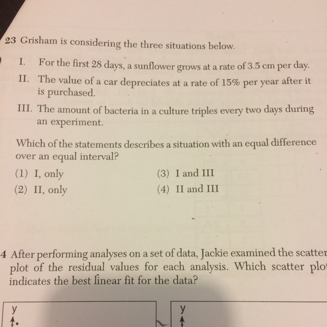 I, only. The first situation is a linear function, growing the same amount every day. (Constant slope) The other two are exponential functions with the amount changing from interval to interval. Even if the percentage remains the same.