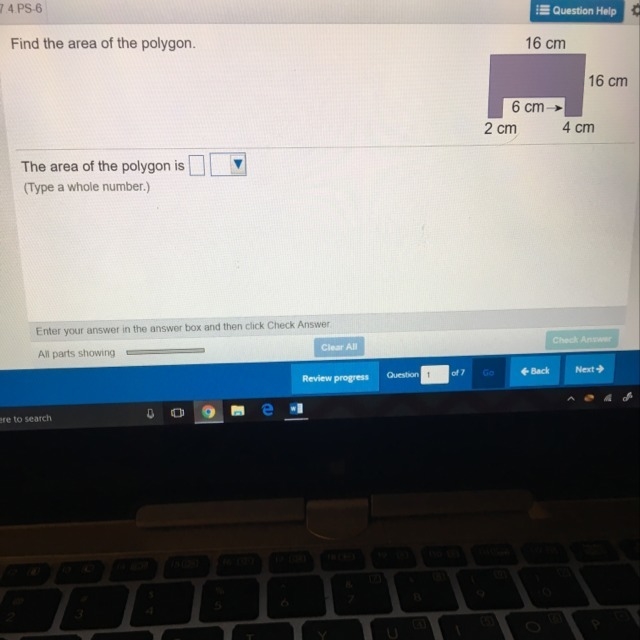 Break this up into three rectangles, one big one and two small ones at the bottom. The formula for area is lxw. For the big rectangle, the length is 16 and the width is 16-6. 16x10=160. For the bottom left one, the length is two and the height is six. 2x6=12. For the last one, the length is 4 and the height is 6. 4x6=24. Add them all together 160+12+24=196 square cm