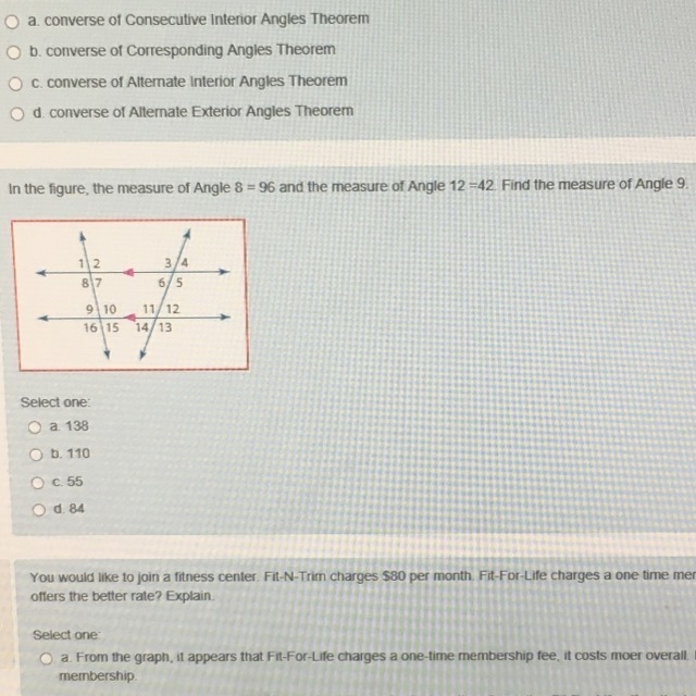 Angles 8 and 9 are supplementary. Supplementary angles equal 180. Therefore, to find the measure of angle 9, subtract the measure of angle 8 (96) from 180.