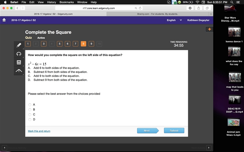 It would be to add nine to each side of the equation (