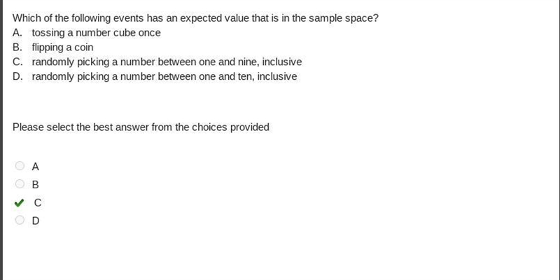 [A] is false. The expected value when tossing a number cube once is 3.5, which is not contained in the sample space {1,2,3,4,5,6}