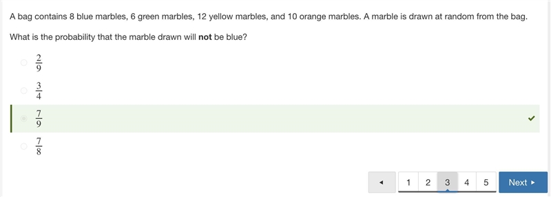 A bag contains 8 blue marbles, 6 green marbles, 12 yellow marbles, and 10 orange marbles. A marble is drawn at random from the bag. What is the probability that the marble drawn…