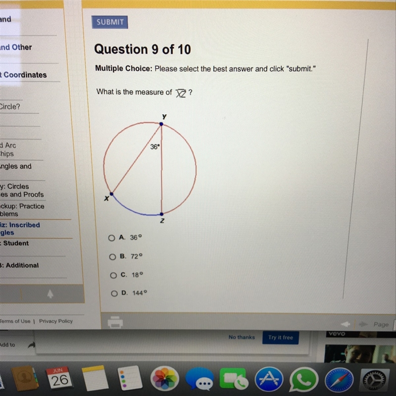 The rule for inscribed angles to arcs is that the measure of the arc is double the measure of the angle. Therefore, we do 36 x 2, which gets us an answer of