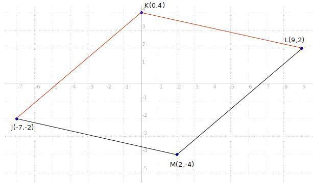 ![\bf \textit{distance between 2 points}\\ \quad \\ \begin{array}{lllll} &x_1&y_1&x_2&y_2\\ % (a,b) J&({{-7 }}\quad ,&{{ -2}})\quad % (c,d) K&({{ 0}}\quad ,&{{ 4}})\\\\ K&({{ 0}}\quad ,&{{ 4}})\quad % (c,d) L&({{ 9}}\quad ,&{{ 2}}) \end{array}\qquad % distance value d = \sqrt{({{ x_2}}-{{ x_1}})^2 + ({{ y_2}}-{{ y_1}})^2} \\\\\\ JK=√([0-(-7)]^2+[4-(-2)]^2)\implies JK=√((0+7)^2+(4+2)^2) \\\\\\ JK=√(7^2+6^2) \\\\\\ KL=√((9-0)^2+(2-4)^2)\implies KL=√(9^2+(-2)^2)]()
