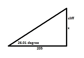 From a boat on the lake, the angle of elevation to the top of a cliff is 26°1'. If the base of the cliff is 205 feet from the boat.