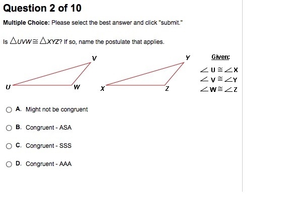 Hence it is not necessary Δ UVW ≅Δ XYZ,as AAA is not a congruence postulate.