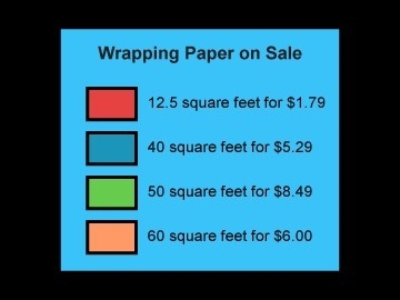 Abe is buying wrapping paper and shopping for the best deal. Drag the rolls of wrapping paper in order from the least to the greatest unit cost in dollars per square foot.