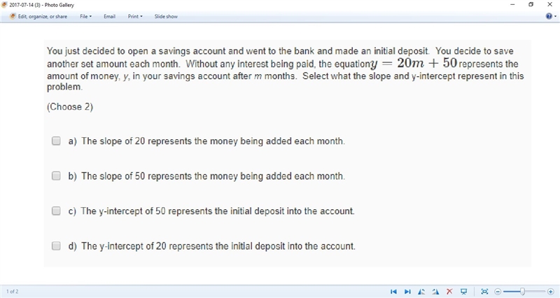The slope, 20 is the amount added each month.
