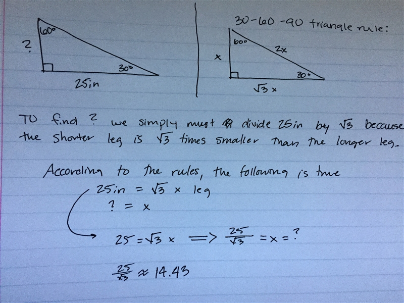 A right triangle has a 30 degree angle. The leg adjacent to the 30 degree angle measures 25 inches. What is the length of the other leg? Round to the nearest tenth.