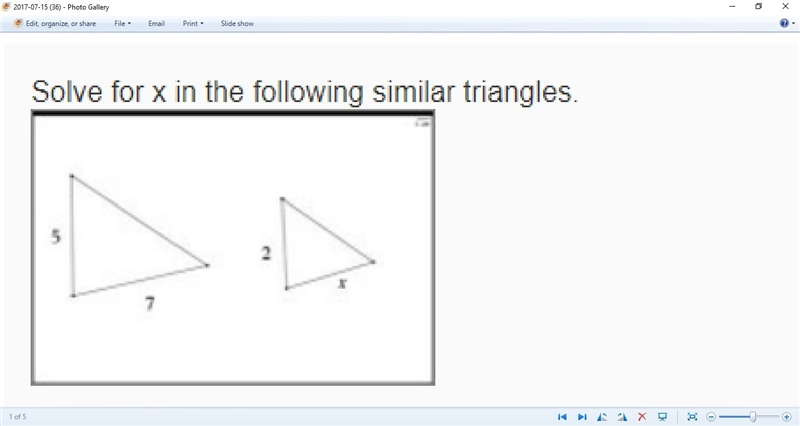 We have two similar triangles. One triangle has the lengths of 5 and 7, while the other has 2 and x. We can set these up as proportions.