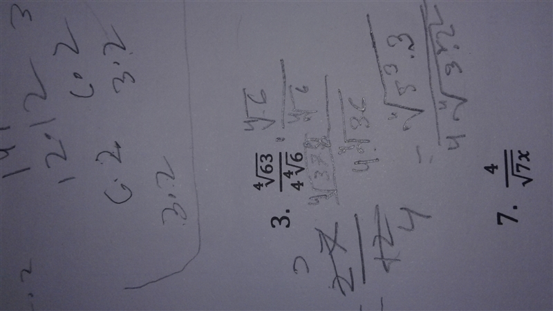 \bf \cfrac{\sqrt[4]{63}}{4\sqrt[4]{6}}\qquad \begin{cases} 63=3\cdot 3\cdot 7\\ 6=2\cdot 3 \end{cases}\implies \cfrac{\sqrt[4]{3\cdot 3\cdot 7}}{4\sqrt[4]{2\cdot 3}}\implies \cfrac{\underline{\sqrt[4]{3}}\cdot \sqrt[4]{3}\cdot \sqrt[4]{7}}{4\sqrt[4]{2}\cdot \underline{\sqrt[4]{3}}} \\\\\\ \cfrac{\sqrt[4]{3}\cdot \sqrt[4]{7}}{4\sqrt[4]{2}}\implies \cfrac{\sqrt[4]{3\cdot 7}}{4\sqrt[4]{2}}\implies \cfrac{\sqrt[4]{21}}{4\sqrt[4]{2}}