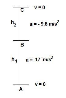 The distance h₁ is traveled from A to B with an upward acceleration of 17 m/s² over 30 s. The distance traveled is
