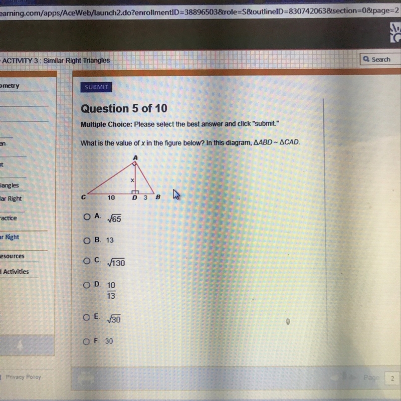 3/x=x/10 ---> x^2=30, x=sqrt(30)