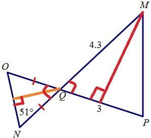 In the bigger triangle, 4.3 is the hypotenuse. We need to solve for the measurement of the long leg which is the opposite of the 78 degree angle.