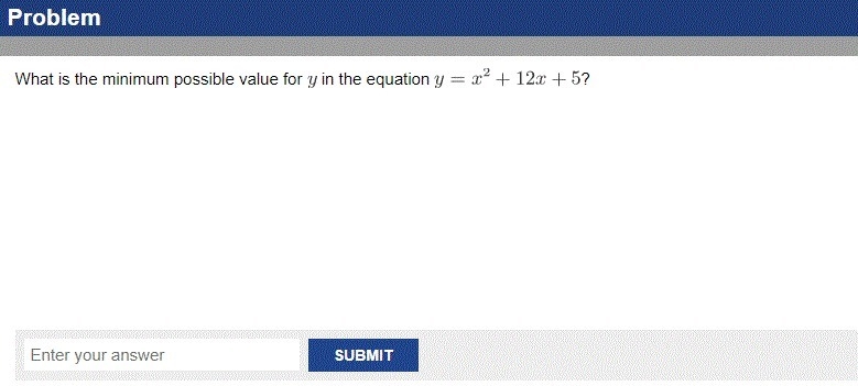 The minimum value for y in the equation y = x² + 12x + 5 is (-6,-31). Here's how I figured it out: