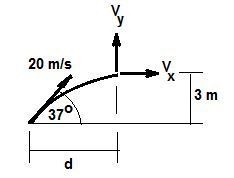 A 1.0 kg football is given an initial velocity at ground level of 20.0 m/s [37 above horizontal]. It gets blocked just after reaching a height of 3.0 m. (a) What is the velocity of the football when it first reaches a height of 3.0 m above the level ground? (b) What horizontal distance has the ball travelled when it first reaches a height of 3.0 m above ground?