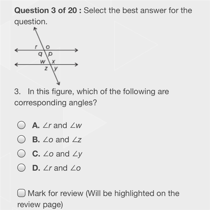 the term corresponding angles means that the angles are in the same relative position. if you look at A, r and w are in the same positions if we.were.to overlap the 2 intersections. So they are corresponding angles