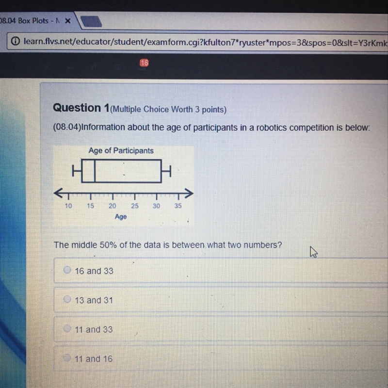 The middle 50 percent of data are ages 13-31. Every segment of the plot is 25%, so in this plot the two center big boxes add up to 50%, which span 13-31 years of age.