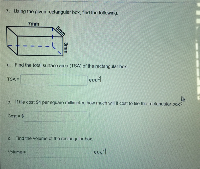 TSA = 2(3*5 + 5*7 + 7*3) = 2(15+35+21) = 2*71 = 142 mm²