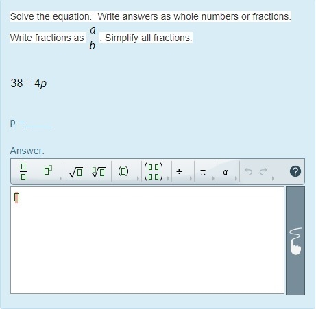 p = 38/4 and simplify p = 19/2 <- answer
