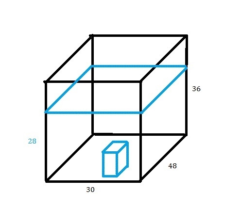 Draw an illustration describing the problem as shown in the attached picture. The black box drawn represents the tank of water with dimensions labeled 30cm×48cm×36 cm. Jennifer and her friends threw heavy solid objects represented by the blue box. It has dimensions of 12cm×12m×20 cm. These boxes occupy the bottom of the tank up to a height of 28 cm drawn by the blue lines. Now, I think the question will be how many of those heavy solid objects will fill up the bottom of the tank. The other question would be, how much is the volume of water displaced by the heavy solid objects.