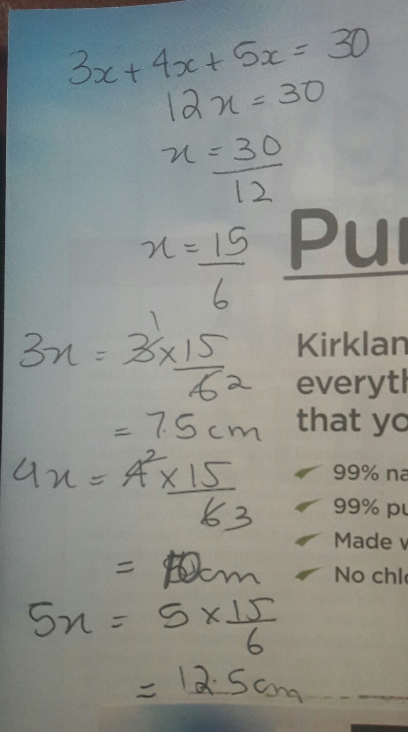 The sides of a triangle are in the ratio 3:4:5. What is the length of each side if the perimeter of the triangle is 30 cm? A. 2.5 cm, 5. cm, 7.5 cm B. 9 cm, 10 cm, 11 cm C. 7.5 …
