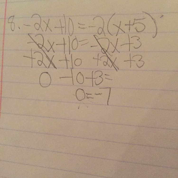 So when you opened up the parenthesis on the right side of the question, you added -2 to 5 instead of multiplying. Since there is no addition sign in between -2 and the parenthesis, it should be multiplication, so -2x + -10.