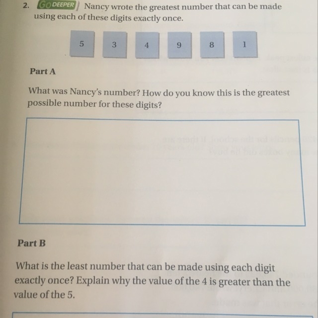 Nancy wrote the greatest number that can be made using each of these digits exactly once. 5,3,4,9,8,1. Part A what was Nancy's number? how do you know this is the greatest possible number for this digits?