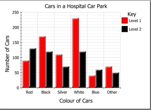 Jack’s sister is coming to visit him and parks in the hospital car park. The bar chart below shows some information about the cars parked in the car park. How many more white than silver cars are parked