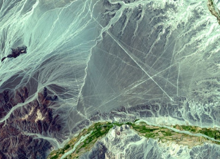 The Nazca lines are located in desert region of Peru, known as the plateau. Historians believe that these lines were created between 500 BCE and 500 CE. Some lines form shapes that can be seen from the air, such as a monkey figure, a hummingbird figure or a spider figure. Most of the lines of Nazca run straight ahead and from the air look like paved roads.