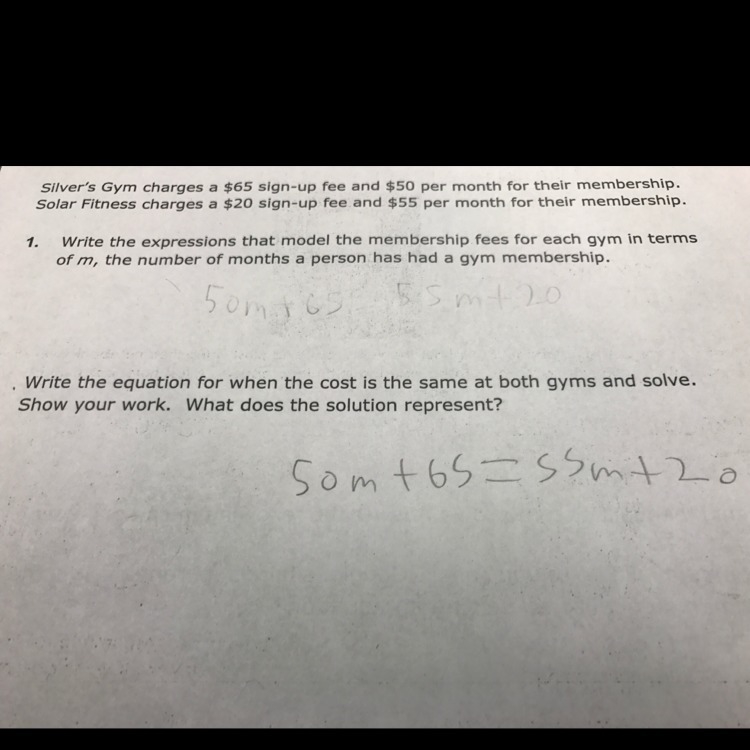 so the first answer is 65+50m because its 65 dollars for sign up PLUS 50 PER month. and 20+55m. The second question is saying that both the gyms have the same price, so I will say that its 50+ 20m for both. It represents the total cost of the gym membership that you have to pay. Hope this helped.