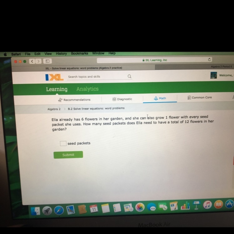 Ella already has 6 flowers in her garden, and she can also grow 1 flower with every seed packet she uses. How many seed packets does Ella need to have a total of 12 flowers in h…
