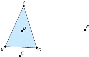 Points E and F lie outside the triangle. If triangle rotated 180° about point E or F then image and preimage of triangle are on the opposite sides of the point or rotation.