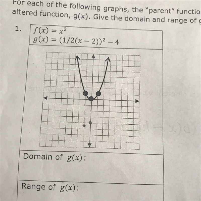 Go down four & 2 to the right. And horizontal stretch by factor of 2. Range is y > or equal to -4 and domain is all real numbers