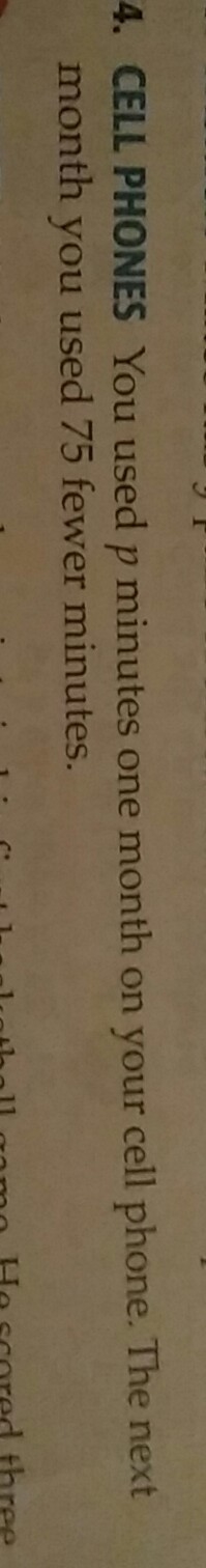 You used p minutes one month on your cell phone the next month you used 75 fewer minutes
