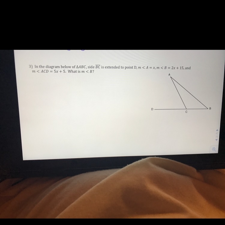 Since a straight line is 180 degrees, ∠ACD and ∠ACB add up to 180 degrees. Therefore, ∠ACB=180-∠ACD=180-5x-5=175-5x. As the angles in a triangle add up to 180 degrees, ∠A+∠B+∠ACB=x+2x+15+175-5x=180=-2x+190. Subtracting 190 from both sides, we get -10=-2x. Next, we can divide both sides by -2 to get x=5 and plugging that into 2x+15=∠B, ∠B=2*5+15=25