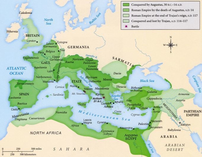 By the year 14 A.D., the Roman empire had expanded to the Atlantic Ocean. In the latter years, it expanded into Britain.