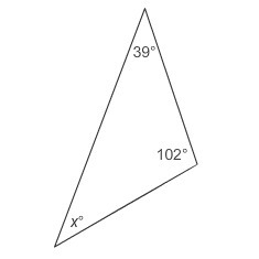 well all triangles have an area of 180 degrees, therefore X=39 because 102+39=141 and 180-141=39.
