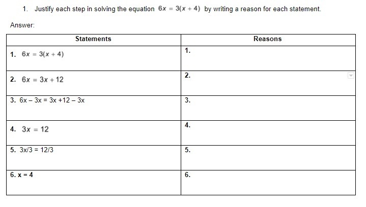 Justify each step in solving the equation 6x = 3(x+4) by writing a reason for each statement.