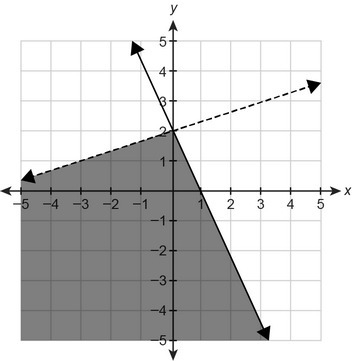 u have a solid line...it has a y int of 2...it has a slope of -2...it is shaded below the line...this inequality is : y < = -2x + 2