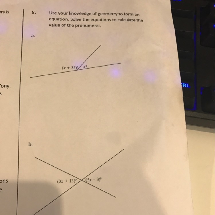 For b, since vertical angles (opposite angles from intersecting lines) are equal, that means that 3x+13=5x-3. Subtracting 3x from both sides as well as adding 3, we get 2x=16. Dividing both sides by 2, we get x=8