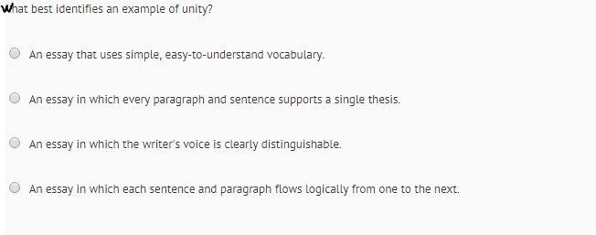 1st on is B. not 2. B an essay in wich every paragraph and sentence supports 3. A 4. B 5. D