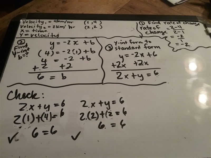 Sandy is observing the velocity of a runner at different times. After one hour, the velocity of the runner is 4 km/h. After two hours, the velocity of the runner is 2 km/h.