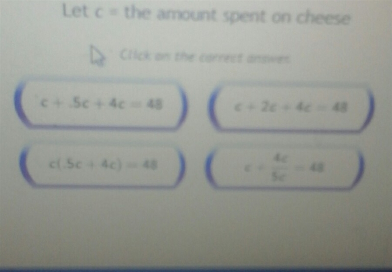 Karla has spent $48 on food. she bought milk cheese and meat. the milk cost half as much as the cheese and the meat cost half as much as the cheese. which equation would help you find the cost of the cheese?