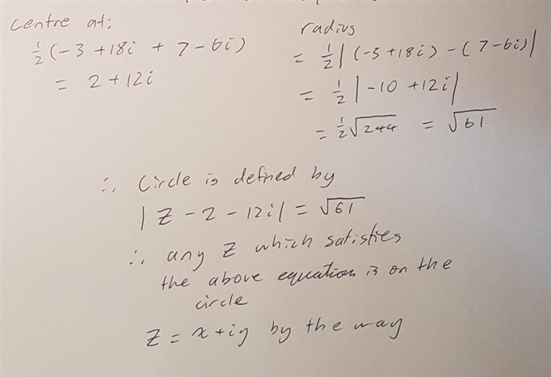 A circle has a diameter with endpoints at –3 + 18i and 7 – 6i. Which point is also on the circle?