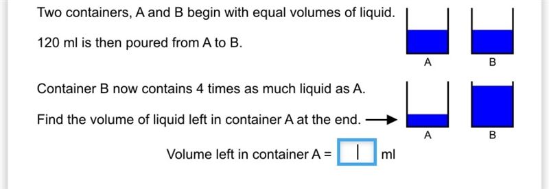If the original volumes of liquid is represented by x, we have x=x for A and B. Since 120mL is poured from A to B, A loses 120 mL (x-120) and B gains 120 mL (x+120). Since we know that B contains 4 times as much liquid as A is now (x-120), we have 4*(x-120)=(x+120)=B. Using the distributive property, we get 4x-480=x+120. Adding 480 to both sides, we get 4x=x+600. After that, we can subtract both sides by x to get 3x=600. Lastly, we can divide both sides by 3 to get x=200=the original amount of liquid. Since A=x-120, we get A=200-120=80